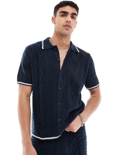 ASOS DESIGN knit spliced cable and pointelle stitch button up polo shirt with tipping in navy - part of a set
