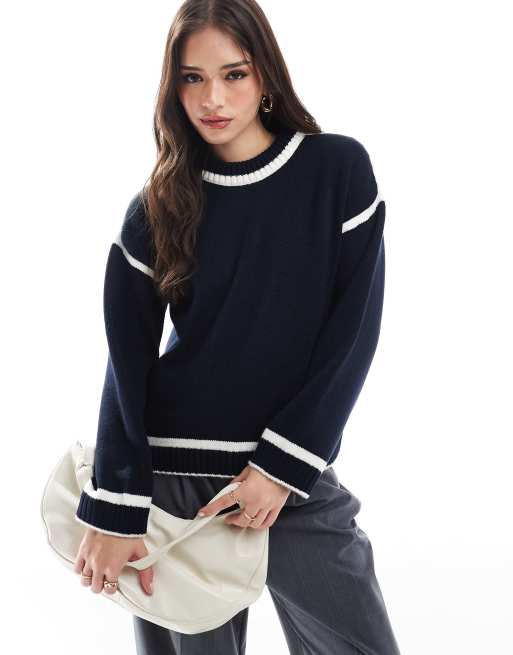 ASOS DESIGN knit sweater with contrast cream seams in navy