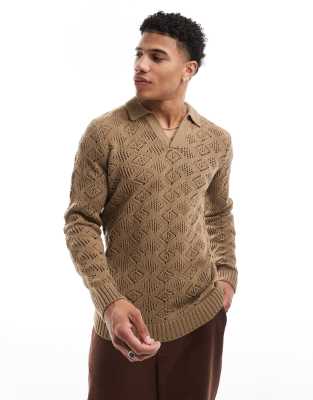 ASOS DESIGN knit sweater with notch neck in brown with texture