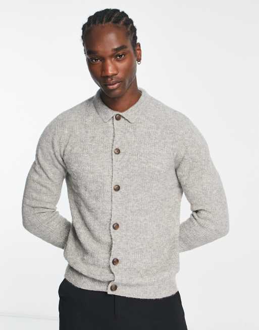 ASOS DESIGN knitted basket stitch button up polo in gray
