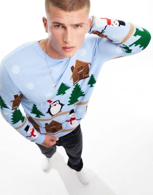 ASOS DESIGN knitted Christmas sweater with nativity scene in blue
