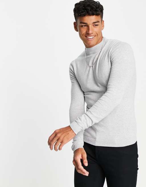 ASOS DESIGN knitted muscle fit turtle neck sweater in light gray
