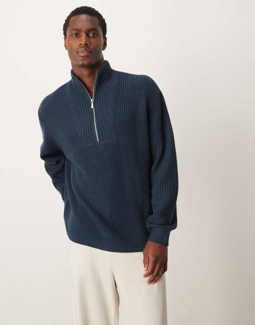 ASOS DESIGN knitted oversized fisherman rib quarter zip sweater in navy