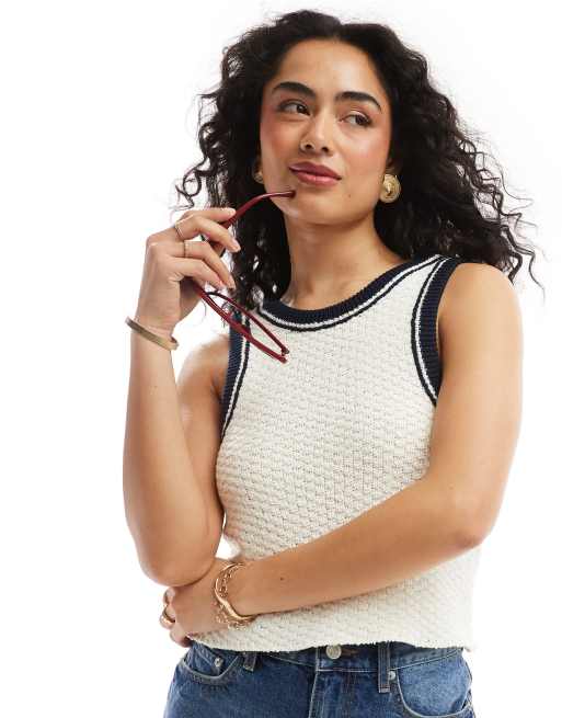 ASOS DESIGN knitted scoop racer tank top in textured yarn with tipping in cream