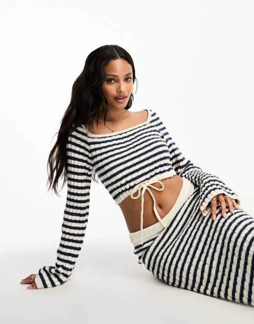 ASOS DESIGN knitted wide neck crop sweater in stripe in navy and cream - part of a set