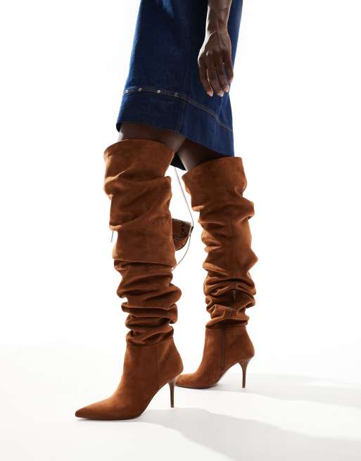 ASOS DESIGN Knock ruched heeled over the knee boots in tan