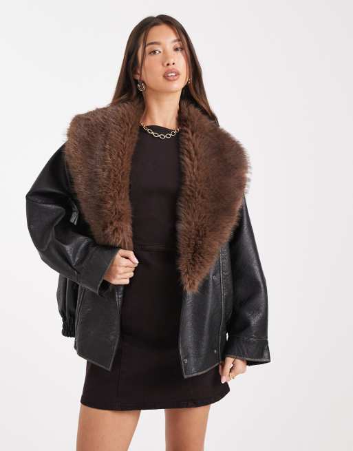 ASOS DESIGN leather look shawl collar faux fur collar bomber jacket in black