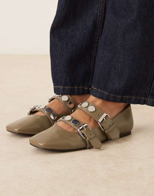 ASOS DESIGN Liesel studded double strap mary jane ballet flats in khaki