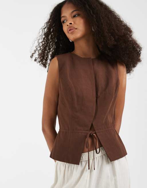 ASOS DESIGN linen blend tailored tie vest in chocolate
