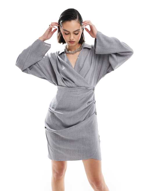 ASOS DESIGN linen look collar wrap long sleeve mini dress with button detail skirt in gray