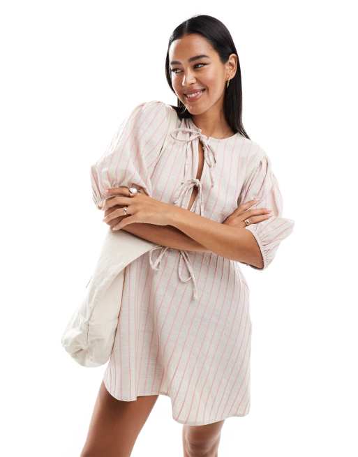 ASOS DESIGN linen look tie front peplum mini dress in natural stripe