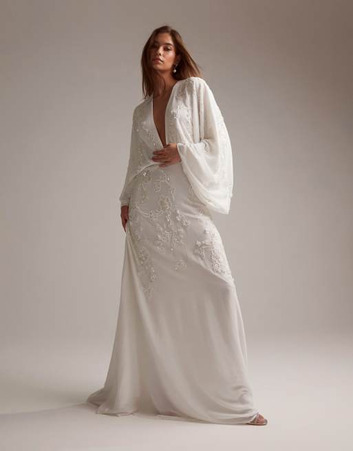 ASOS DESIGN Lisa drape sleeve plunge wedding dress with floral embellishment in ivory