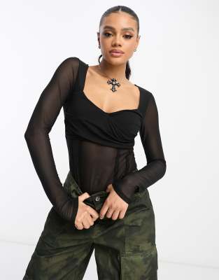 ASOS DESIGN long sleeve mesh panel wrap bodysuit in black