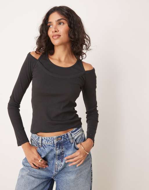 ASOS DESIGN long sleeve ribbed top with cut-out detail in black