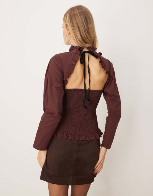 ASOS DESIGN long sleeve smocked top with open back in brown