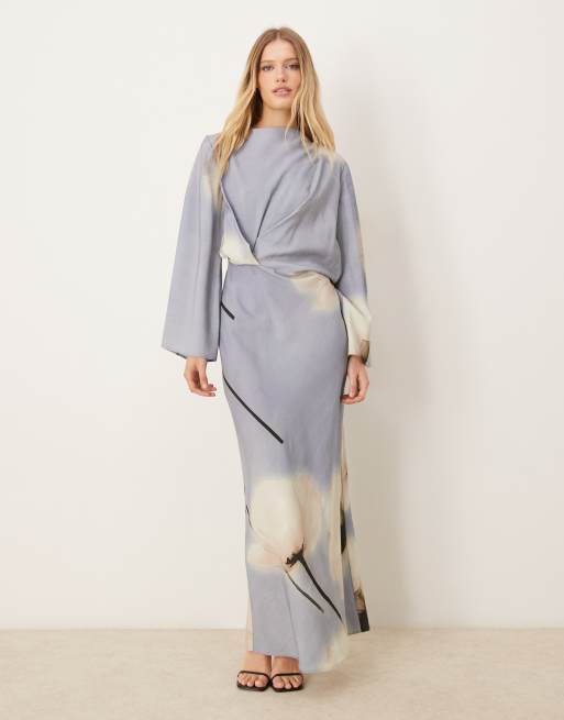 ASOS DESIGN long sleeve tucked waist bias cut maxi dress in blue bold floral print