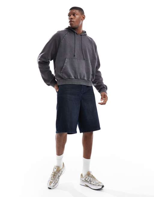 ASOS DESIGN longer length denim jorts in mid wash blue