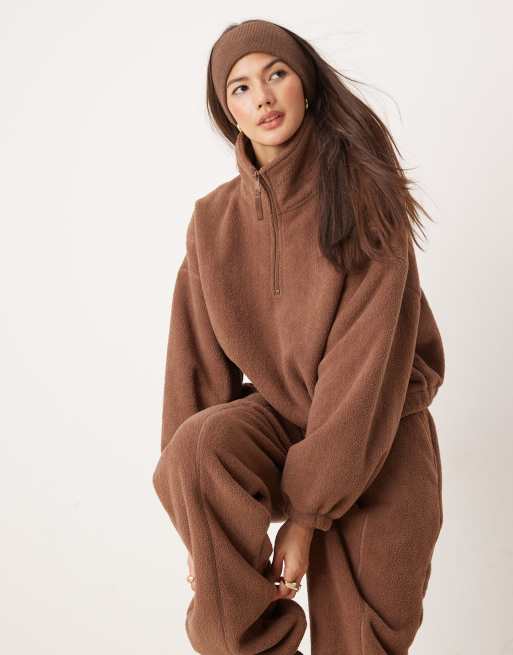 ASOS DESIGN lounge microfleece zip collar sweatshirt in brown