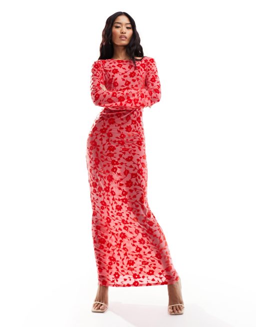 ASOS DESIGN low back sheer burnout mesh maxi dress with angel sleeves in red