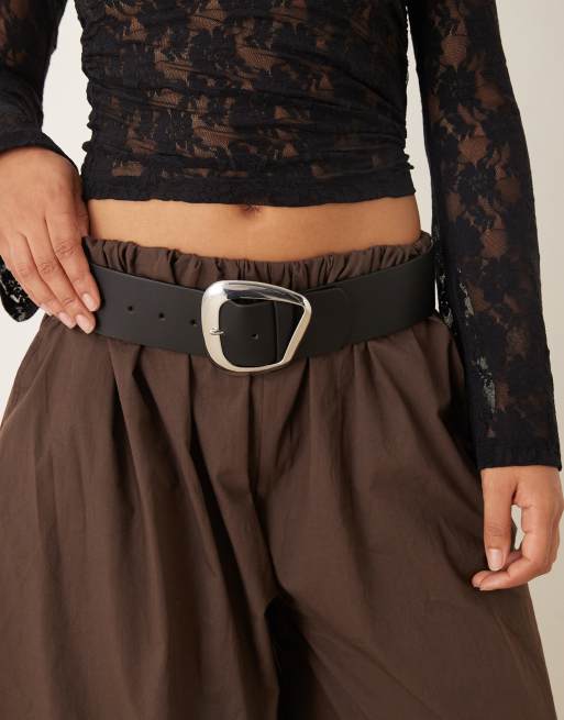 ASOS DESIGN low waist wide belt with abstract square silver buckle in black