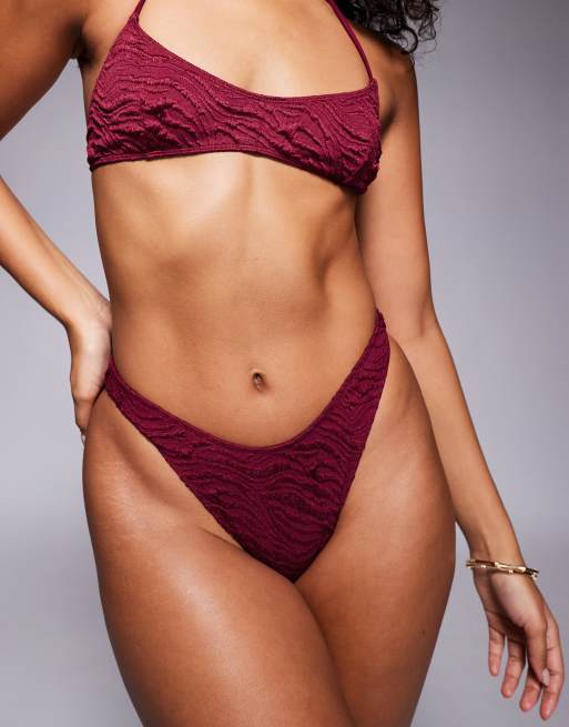 ASOS DESIGN Maria textured high leg hipster bikini bottoms in burgundy