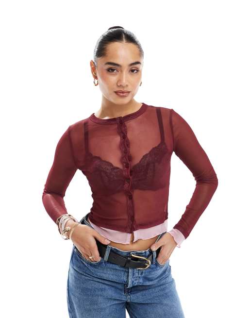 ASOS DESIGN mesh button up crop top with contrast trim in burgundy