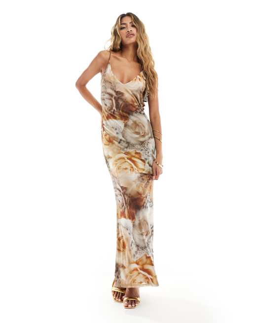 ASOS DESIGN mesh cami maxi dress with ruffle back detail in gold rose print