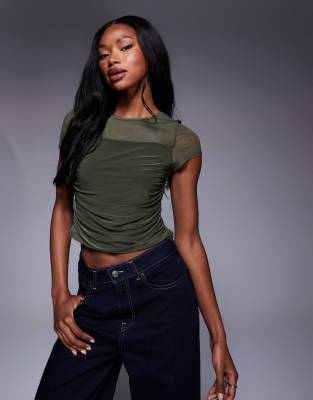 ASOS DESIGN mesh draped front short sleeve top in khaki