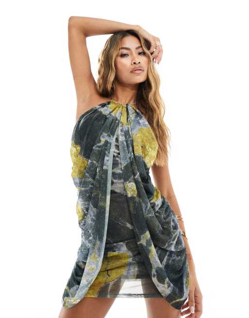ASOS DESIGN mesh draped halter mini dress in gray smudge print