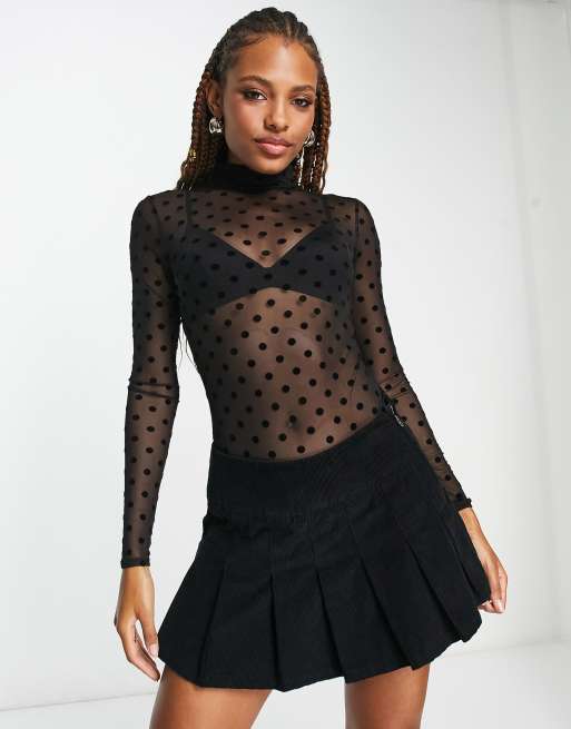 ASOS DESIGN mesh long sleeve textured polka dot flock bodysuit in black