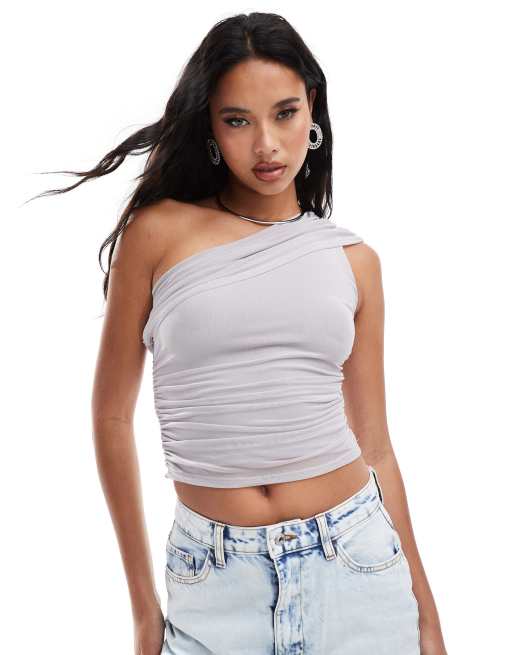 ASOS DESIGN mesh one shoulder drape gathered top in gray