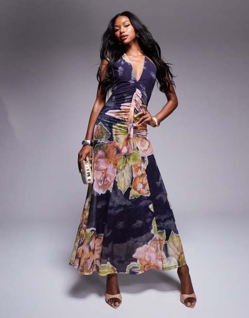 ASOS DESIGN mesh plunge front maxi dress with flare detail and sweeping hem in floral print