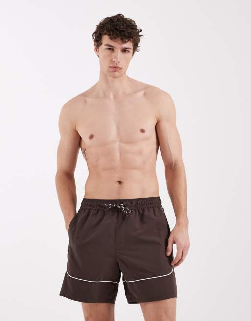 ASOS DESIGN mid length swim shorts in brown with contrast white binding