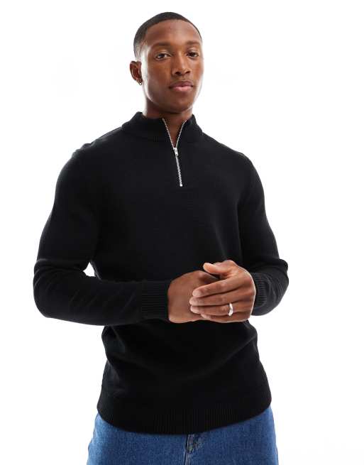 ASOS DESIGN midweight knitted quarter zip high neck sweater in black