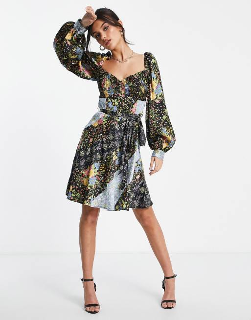 ASOS DESIGN mini tea dress with belt in mixed floral prints