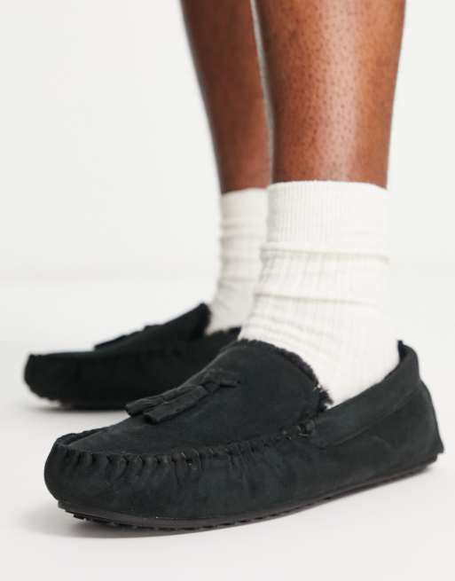 ASOS DESIGN moccasin slippers with faux fur lining in black