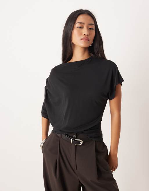 ASOS DESIGN modal cinched waist drapey one shoulder tee in black
