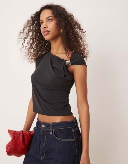 ASOS DESIGN modal one sleeve t-shirt with silver trim in black