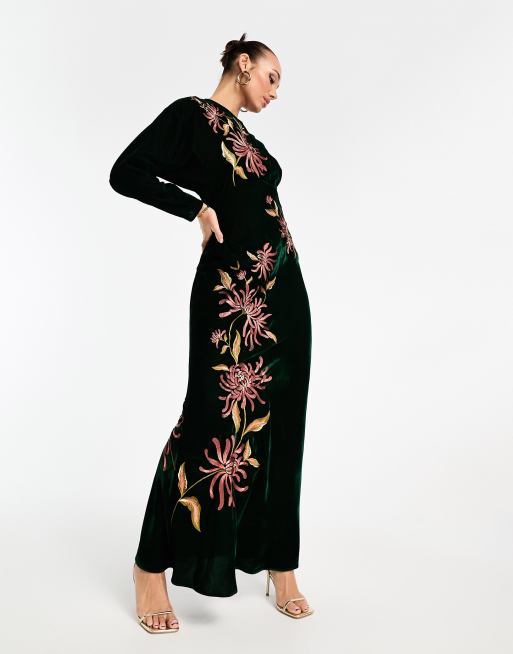 ASOS DESIGN Modesty velvet batwing bias maxi dress with floral embroidery in forest green