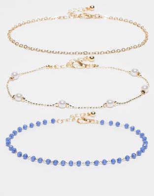 ASOS DESIGN multipack of anklets with blue beads and faux pearls in gold tone