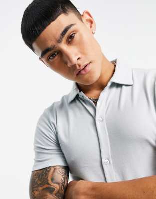 ASOS DESIGN muscle fit button up jersey shirt in gray blue