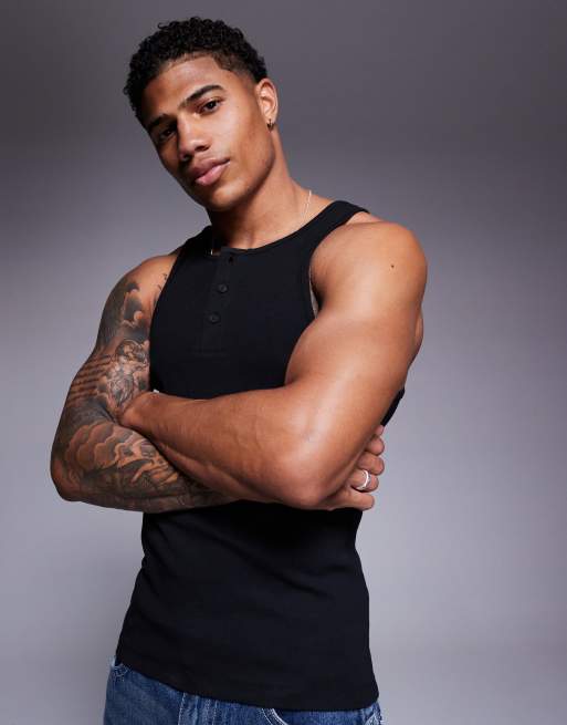 ASOS DESIGN muscle fit henley ribbed tank top in black