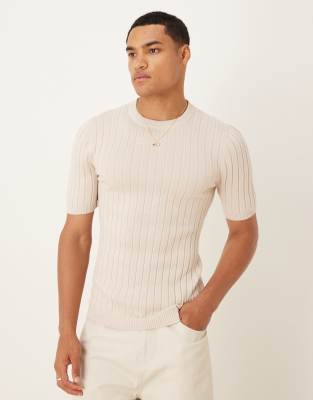 ASOS DESIGN muscle fit lightweight rib knit t-shirt in stone