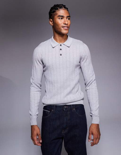 ASOS DESIGN muscle fit long sleeve knit rib polo in light gray heather