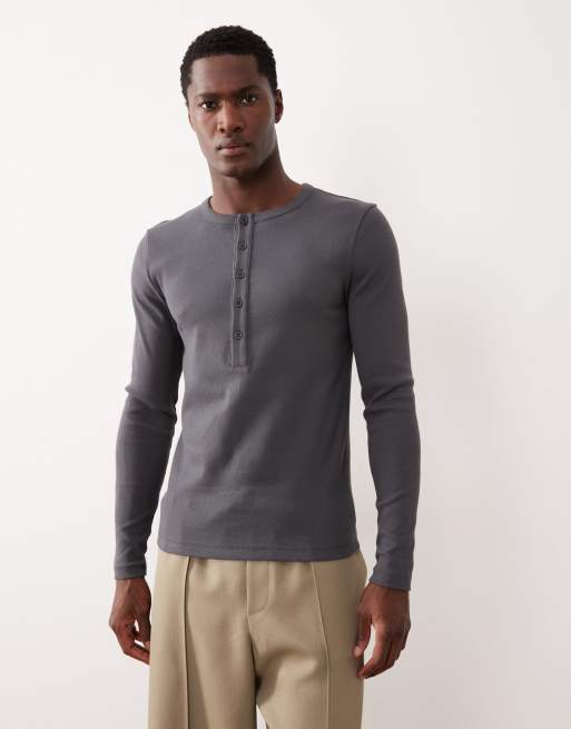 ASOS DESIGN muscle fit long sleeve t-shirt with henley neck in charcoal rib knit