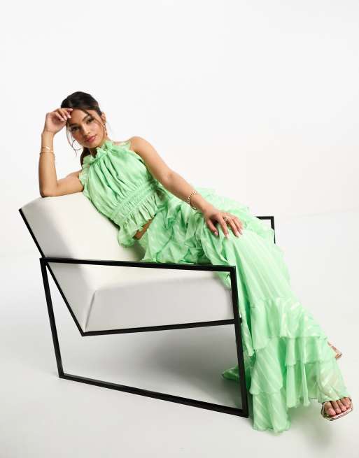 ASOS DESIGN occasion ruffle halterneck top in green satin stripe - part of a set