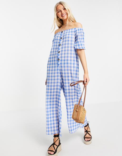 ASOS DESIGN off shoulder button front textured jumpsuit in blue gingham