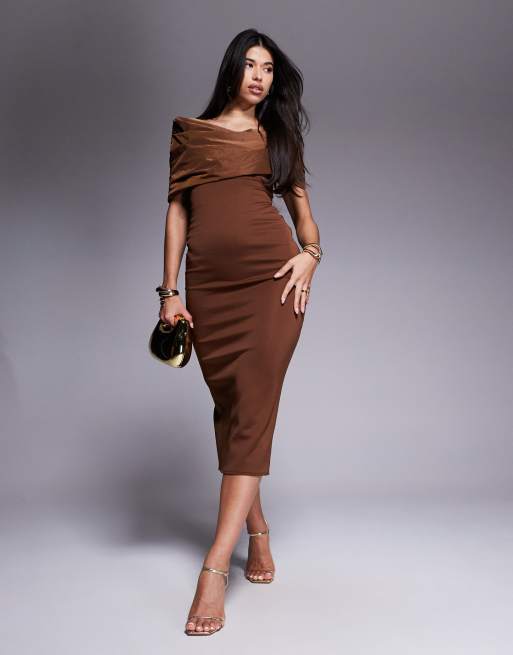 ASOS DESIGN off the shoulder manipulated taffeta bodice detail midi dress in mocha