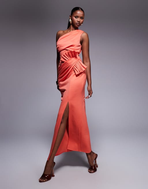ASOS DESIGN one shoulder pleated detail mini dress in Coral in scuba-style fabric