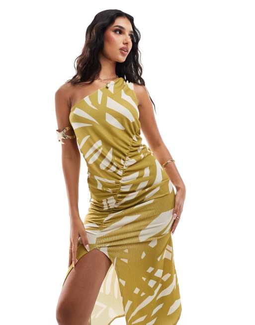ASOS DESIGN one shoulder ruched midi dress with front split in green geo print